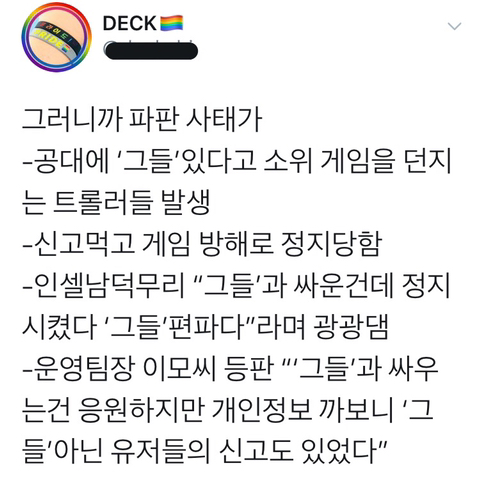 1. 같이 하는 유저가 페미라는 이유로 고의트롤링하는 한남 속출