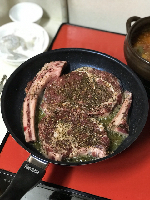고기에 소금/후추/말린 바질/스테이크용 시즈닝/올리브유로 밑간하고 굽다가