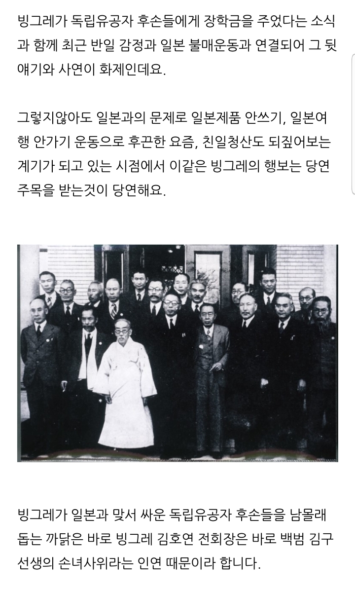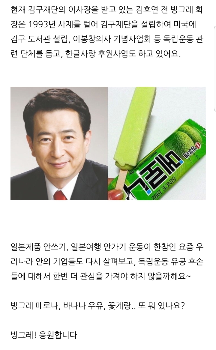[흥미돋]빙그레가 독립유공자 후손에게 장학금 주는 사연 작성자lanni|작성시간19.08.29|조회수2,094 목록 댓글 5 글자크기 작게가 글자크기 크게가 출처 :https://m.blog.naver.com/PostView.nhn?blogId=bonnah9&logNo=221594779069&proxyReferer=https%3A%2F%2Fm.search.daum.net%2Fsearch%3Fq%3D%25EB%25B9%2599%25EA%25B7%25B8%25EB%25A0%2588%2520%25EB%258F%2585%25EB%25A6%25BD%25EC%259C%25A0%25EA%25B3%25B5%25EC%259E%2590%26w%3Dtot%26nil_mtopsearch%3Dsuggest%26DA%3DUME%26rq%3D%26sq%3D%25EB%25B9%2599%25EA%25B7%25B8%25EB%25A0%2588%2520%25EB%258F%2585%25EB%25A6%25BD%26o%3D1%26sugo%3D1 다음검색 현재 게시글 추가 기능 열기 북마크 공유하기 신고 센터로 신고 댓글 댓글 5 댓글쓰기 답글쓰기 댓글 리스트 작성자김줘영 | 작성시간 19.08.29 한화회장 친동생임 작성자슬레이트 | 작성시간 19.08.29 오~~~~ 메로나 좋게 생각했어 작성자Originally | 작성시간 19.08.29 맨날 메로나만 먹어 작성자보물섬 | 작성시간 19.08.29 좀 쎄하게 생겼는데 작성자정신차리고 주변을 돌아봐 | 작성시간 19.08.29 걍 ㅈㄴ 이미지메이킹하느라마케팅하려고그런거같음 댓글 전체보기