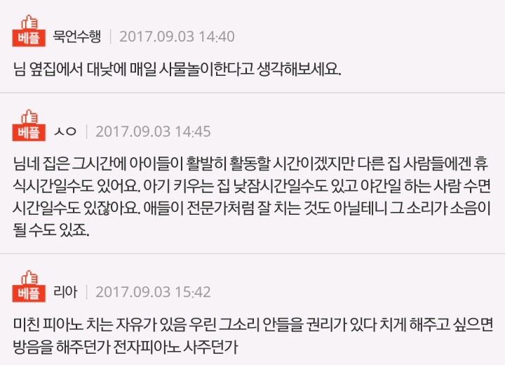 정싫으면 이사가던지 ~ 참 이웃들이 초등학생애가 피아노치는것가지고 배려할줄도모르는사람들이죠