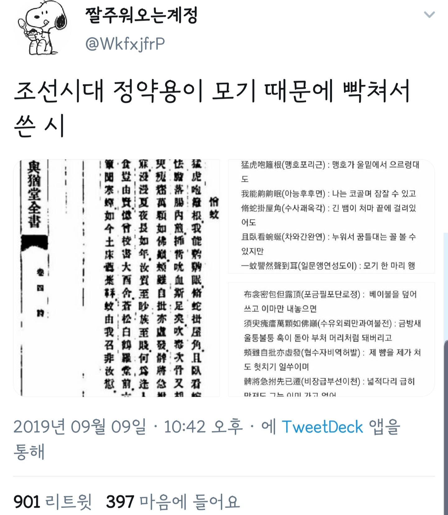 [흥미돋]조선시대 정약용이 모기 때문에 빡쳐서 쓴 시 작성자서지혜(1984.8.24)|작성시간19.09.10|조회수23,494 목록 댓글 12 글자크기 작게가 글자크기 크게가 출처 :https://twitter.com/WkfxjfrP/status/1171056179214082048?s=19 다음검색 현재 게시글 추가 기능 열기 북마크 공유하기 신고 센터로 신고 댓글 댓글 12 댓글쓰기 답글쓰기 댓글 리스트 작성자공부왜이렇게잘되지 | 작성시간 19.09.10 ㅋㅋㅋㅋㅋㅋㅋㅋ저땐버물리도없자나ㅋㅋ큐ㅠ 작성자duwk | 작성시간 19.09.10 붐업입니다ㅠ 작성자R=VD 공기업취뽀 | 작성시간 19.09.10 오능 얼굴에 물림 미친 사패모기새끼 작성자망충하마 | 작성시간 19.09.10 좋아요👍 작성자요구르츠처돌이 | 작성시간 19.09.11 ㅋㅋㅋㅋㅋㅋㅋㅋㅋㅋㅋㅋㅋㅋㅋㅋㅋㅋㅋㅋ신기하다 댓글 전체보기