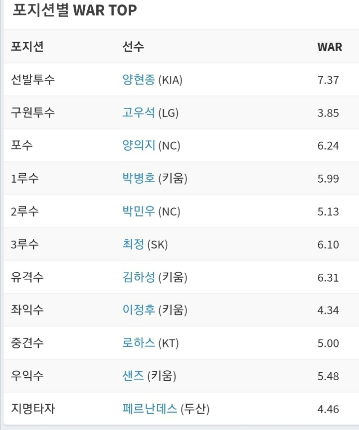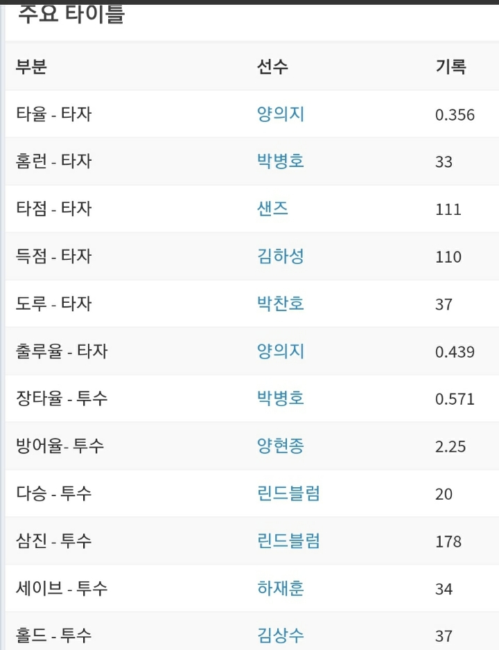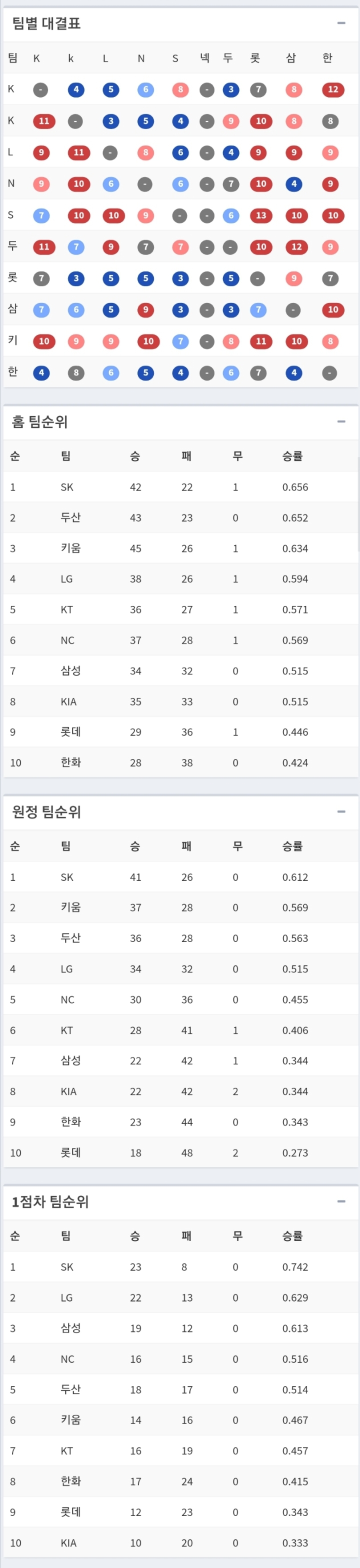 [흥미돋][프로야구] 현재까지 각종 팀 기록 및 선수 기록 작성자데이터 야구|작성시간19.09.17|조회수2,615 목록 댓글 47 글자크기 작게가 글자크기 크게가 출처 : http://www.statiz.co.kr/main.php 다음검색 현재 게시글 추가 기능 열기 북마크 공유하기 신고 센터로 신고 댓글 댓글 47 댓글쓰기 답글쓰기 댓글 리스트 작성자14.박계범 | 작성시간 19.09.18 왜 아무도 없냐 작성자아미해머 | 작성시간 19.09.18 포지션탑에 선수가 몇명이나 올라가있는데,,, 왜.... 작성자달달팝콘 | 작성시간 19.09.18 기아는 그냥 현종타이거즈로 구단 이름 변경해라ㅡㅡ 작성자Quad | 작성시간 19.09.18 갠씨 불펜 투명하고요...^^ 작성자Cherryblossom | 작성시간 19.09.18 개스크 투수가 먹여살리네 댓글 전체보기