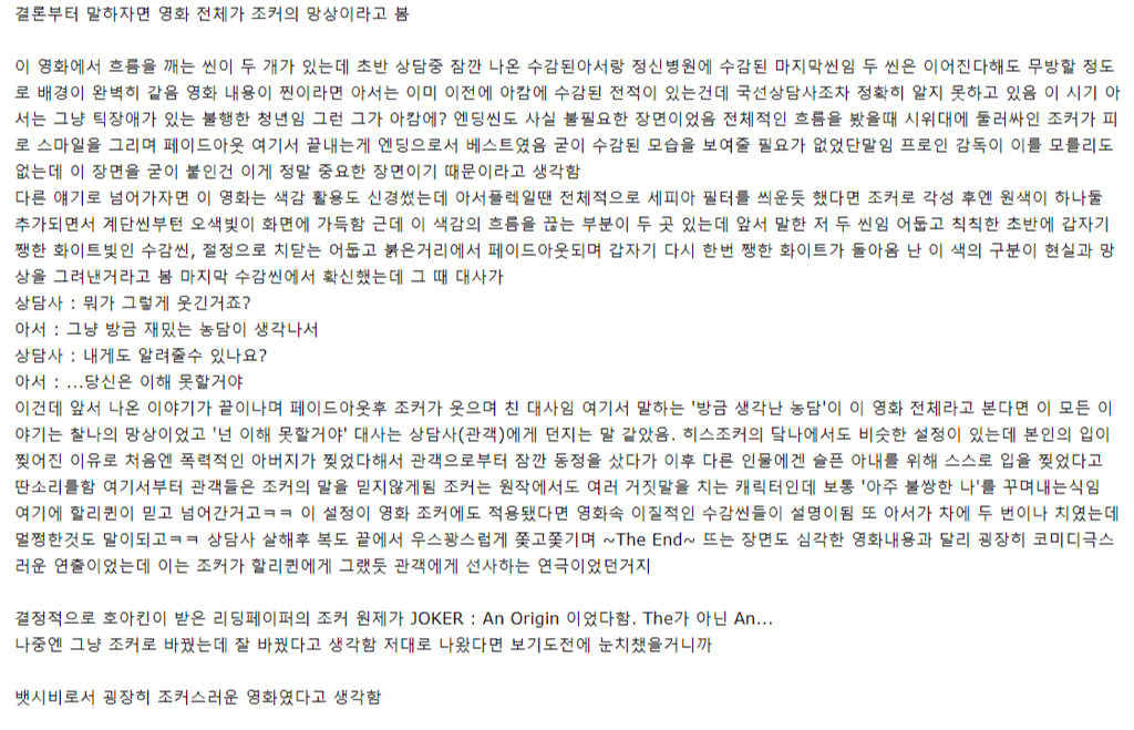 이건데 앞서 나온 이야기가 끝이나며 페이드아웃후 조커가 웃으며 친 대사임 여기서 말하는 '방금 생각난 농담'이 이 영화 전체라고 본다면 이 모든 이야기는 찰나의 망상이었고 '넌 이해 못할거야' 대사는 상담사(관객)에게 던지는 말 같았음. 히스조커의 닼나에서도 비슷한 설정이 있는데 본인의 입이 찢어진 이유로 처음엔 폭력적인 아버지가 찢었다해서 관객으로부터 잠깐 동정을 샀다가 이후 다른 인물에겐 슬픈 아내를 위해 스스로 입을 찢었다고 딴소리를함 여기서부터 관객들은 조커의 말을 믿지않게됨 조커는 원작에서도 여러 거짓말을 치는 캐릭터인데 보통 '아주 불쌍한 나'를 꾸며내는식임 여기에 할리퀸이 믿고 넘어간거고ㅋㅋ 이 설정이 영화 조커에도 적용됐다면 영화속 이질적인 수감씬들이 설명이됨 또 아서가 차에 두 번이나 치였는데 멀쩡한것도 말이되고ㅋㅋ 상담사 살해후 복도 끝에서 우스꽝스럽게 쫓고쫓기며 ~The End~ 뜨는 장면도 심각한 영화내용과 달리 굉장히 코미디극스러운 연출이었는데 이는 조커가 할리퀸에게 그랬듯 관객에게 선사하는 연극이었던거지