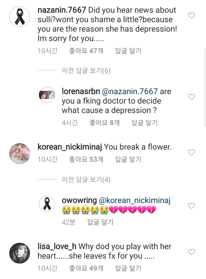 2댓글: 너가 꽃을 파괴했어. (꽃이라니 ㅋㅋㅋㅋ 설리 본인이 그토록 싫어했던 워딩인데)