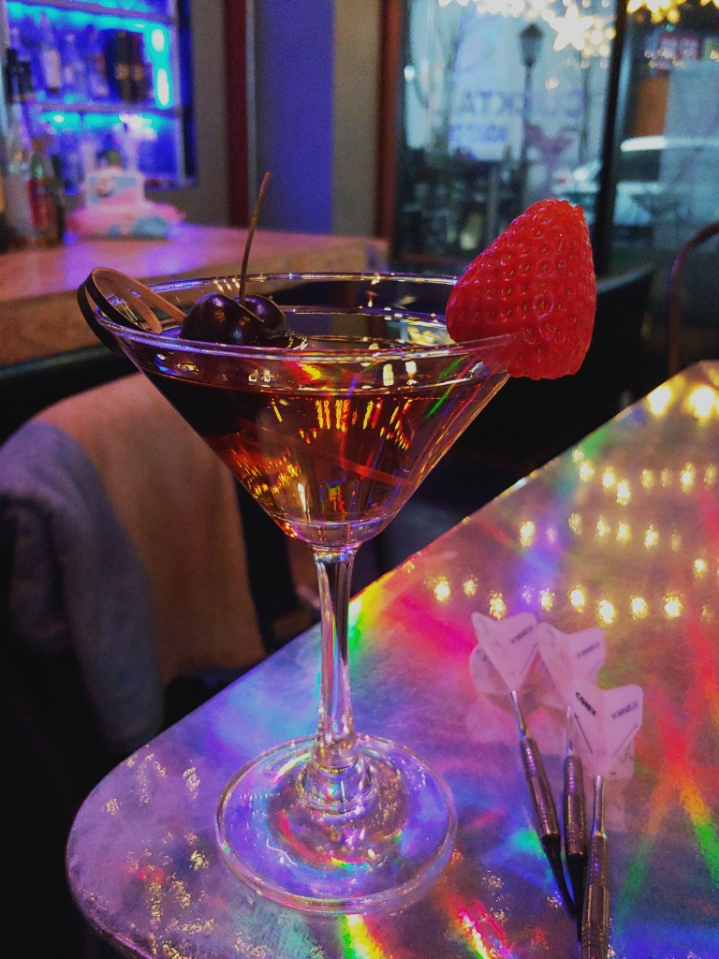 맨하탄!(인가.. 러스티네일인가.. 체리들었으니까 맨하탄!) 버번위스키 베이스 도수도 쎄지만 버번 스위트베르뭇등 향이 강한 술로만 만들어져서 호불호도 갈림