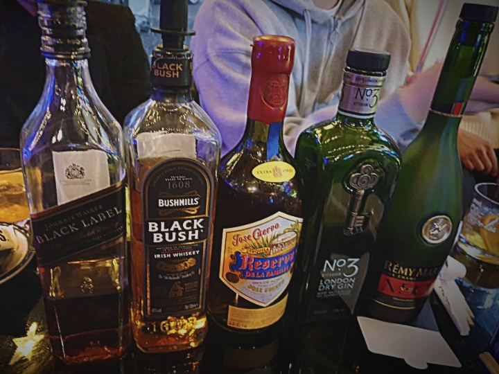 조니워커블랙-블랙부쉬(아이리쉬 위스키)-데낄라 이름기억안남;-런던드라이no3(진)-레미마틴 vsop(꼬냑)