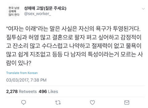 작성자으아악한남 작성시간 19.10.19 지들이 섹에 미쳐서 여자를 존나게 좋아하니까 동시에 자신의 사랑을 받는 여자를 부러워 하는 듯 여자들이 남자와의 섹을 그렇게 즐기지 않을 뿐더러 존나게 좋아해주는건 목숨에 위협된다는 사실을 모름 오나홀을 쓰는 남자도 오나홀로밖에 성욕을 풀지 못하게 한다고 여자들을 미워함