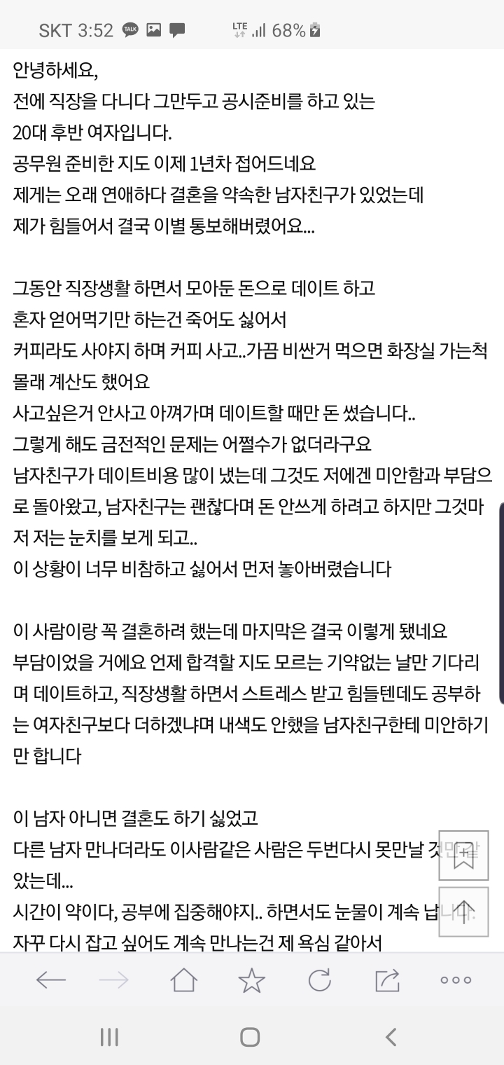 근데 절케 데이트비용에 연연해하고 저러는 건 솔직히 한심해보여.. 저럴 생각할 시간에 공부 한 자라도 더해야지....
