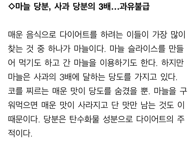 tmi 마늘 처돌이인 한국인들이 마늘 때문에 살이 안찌는데 영향 있진 않을까 🤔 궁금해서 검색하다 위 기사를 발견했고 그와중에 마늘 당도가 사과랑 콜라보다 높다는거 처음 알아서 흥미돋아서 가져옴 ㅋㅋ !!