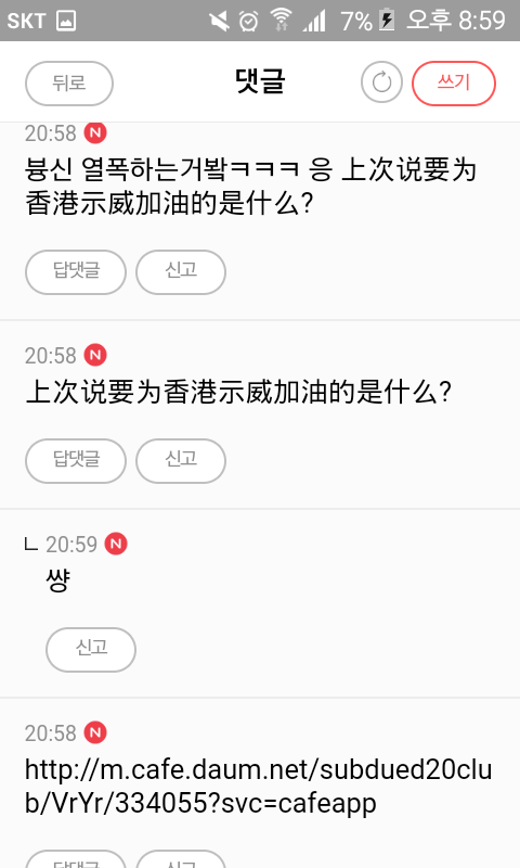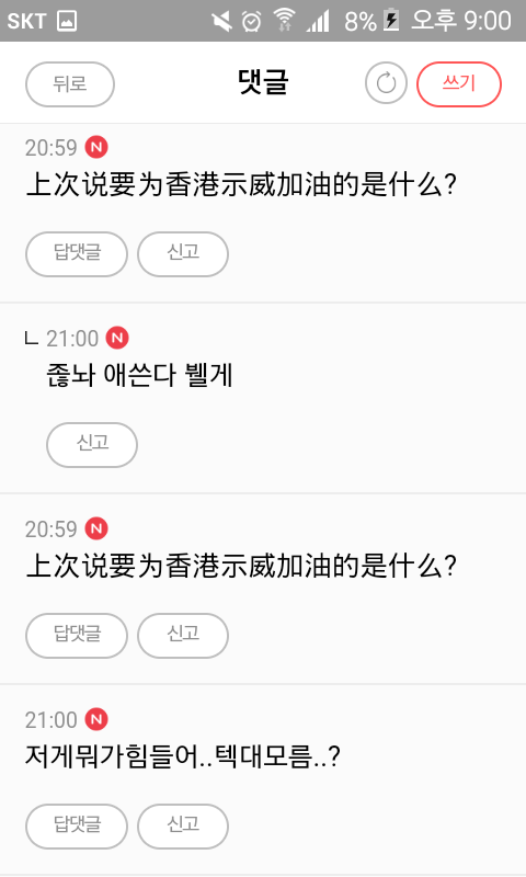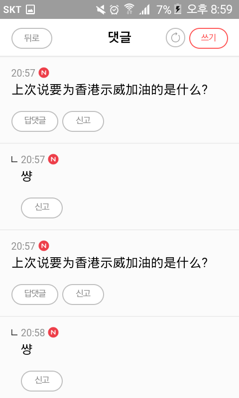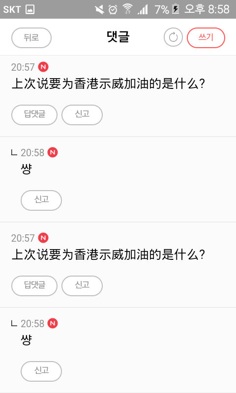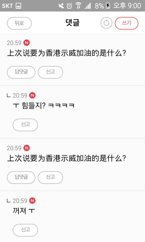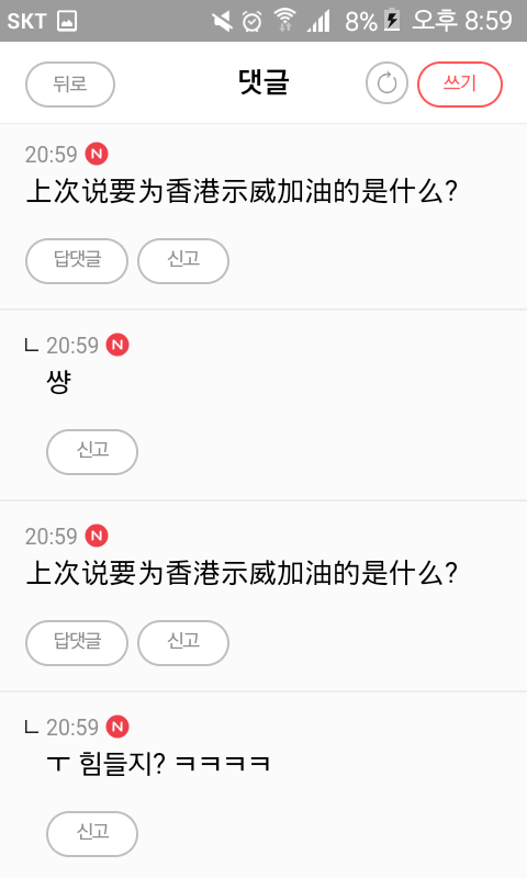 홍콩 시위 얘기 꺼내자마자 발작 버튼 제대로 눌려서 욕하는게 씹소름임