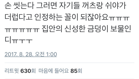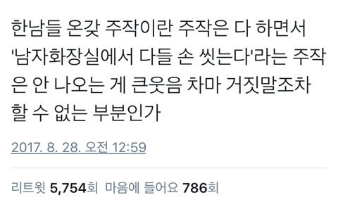 [스크랩] [흥미돋]한남들이 유일하게 주작하지 않는 것.twt 작성자나가주세요|작성시간19.11.19|조회수12,518 목록 댓글 38 글자크기 작게가 글자크기 크게가 바로 화장실에서 손씻기 ㅋㅋㅋㅋㅋㅋㅋㅋ 조나단 on Twitter“한남들 온갖 주작이란 주작은 다 하면서 '남자화장실에서 다들 손 씻는다'라는 주작은 안 나오는 게 큰웃음 차마 거짓말조차 할 수 없는 부분인가”twitter.com +저 트윗에 달린 멘션들 ㅁㅊ ㅋㅋㅋㅋㅋㅋㅋㅋㅋㅋㅋㅋㅋㅋ 다음검색 스크랩 원문 : 쭉빵카페 현재 게시글 추가 기능 열기 북마크 공유하기 신고 센터로 신고 댓글 댓글 38 댓글쓰기 답글쓰기 댓글 리스트 작성자홍시요정 | 작성시간 19.11.19 으시발 작성자home, sweet home | 작성시간 19.11.19 이래서 피시방을 못가겠어...여성전용 피시방 생겼으면 ㅠㅠㅠㅠ 작성자탕탕마라탕 | 작성시간 19.11.19 진심으로 노량진 경찰 학원에 거의 남자인데 아무도 손 안 씻어.. 아무도.. 진짜 아무도.. 찐임 진짜.. 하.. 작성자스윗칠리소스 | 작성시간 19.11.19 윽 드러 작성자앱충벌레죽어 | 작성시간 19.11.19 존나 더러워 댓글 전체보기
