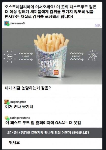 작성자주문은안으로들어와서 작성시간 19.11.20 호주갈매기한테도 통할지모르겠는데 비둘기 쫓을수있는 팁줄게