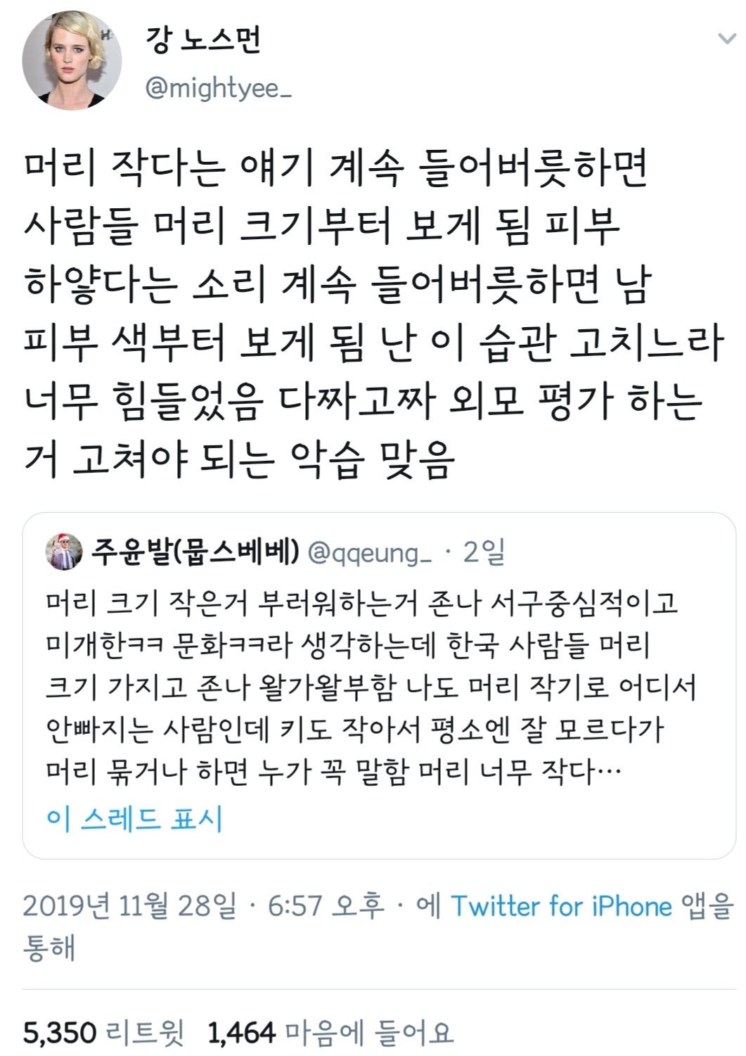 작성자Death by a thousand cut 작성시간 19.11.30 나 머리 큰데 어릴때 애들 필터없이 말하잖아.. 주어가 어떻든 머리크기 얘기 나오면 자꾸 주눅들게 됨