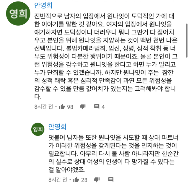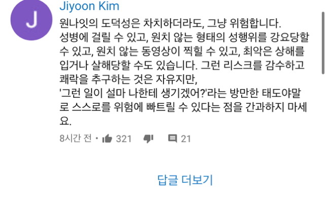 작성자Abraxas 작성시간 19.12.04 도덕적 문제로 보기보다는 러시안룰렛같은 거라고 생각함. 당연 일대일의 관계면 남들이 왈가왈부하는 것은 좀 부당한 오지랖같은 거겠지만, 성관계는 단순히 일대일의 관계로 보면 안되거든. 얼마 전에 부산지역 에이즈 환자 성착취 기사 떴을때 그 지역 챙롬들만 불안했을까? 아마 그 지역 사람들 상당수가 불안해 했을걸. 낯선 사람과의 원나잇 역시 본질적으로 이런 문제를 안고 있다고 생각함.