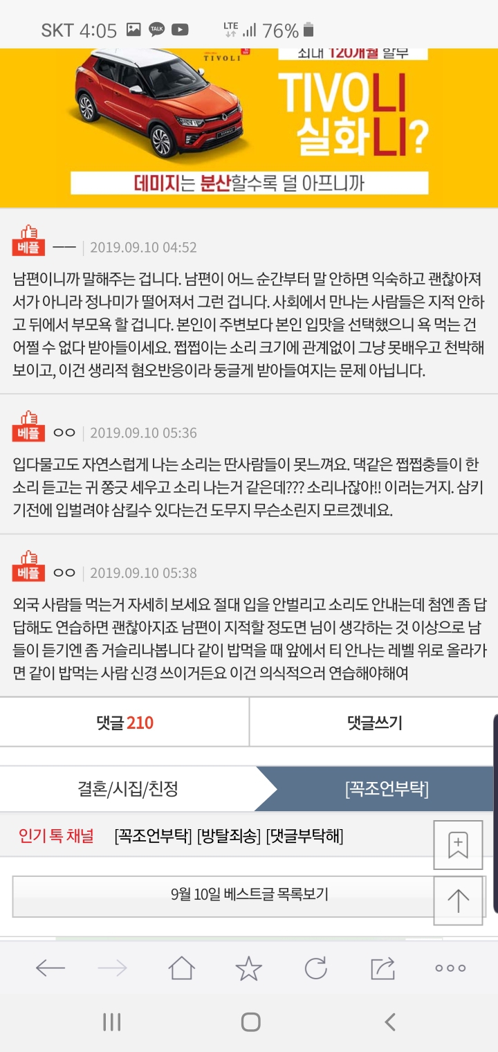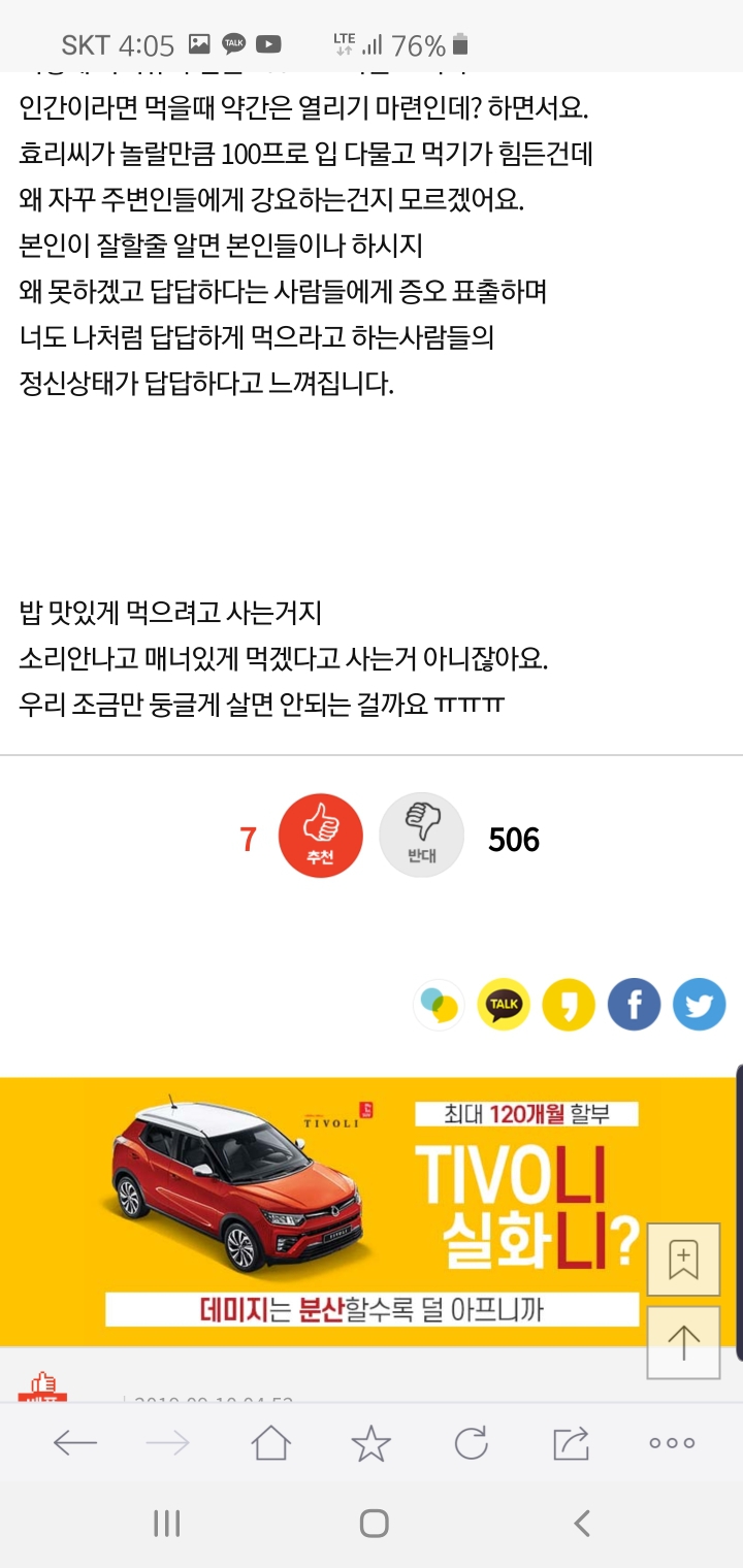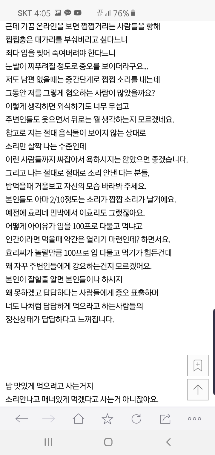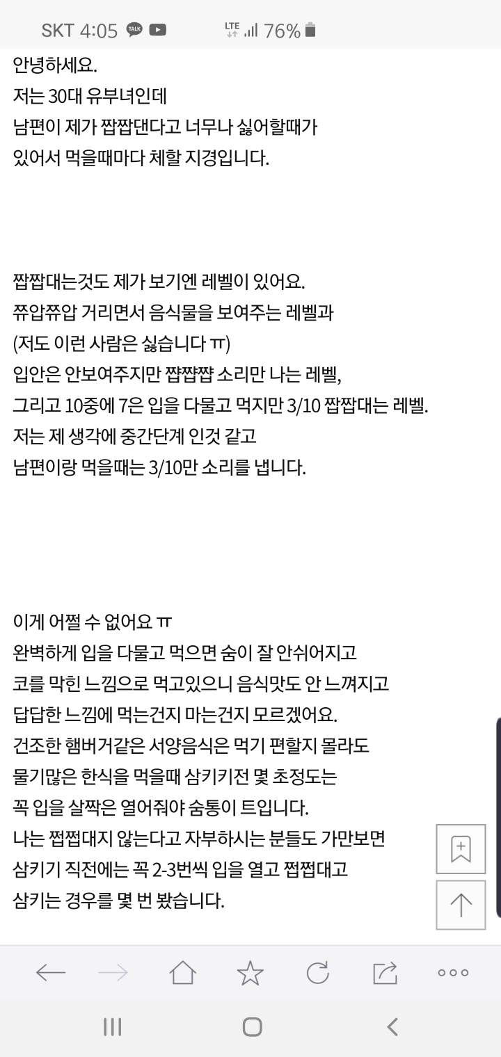 작성자편살편행 작성시간 19.12.20 아 진짜 시름ㅠㅠ 쩝쩝대는 사람이랑 밥먹으면 스트레스받음...