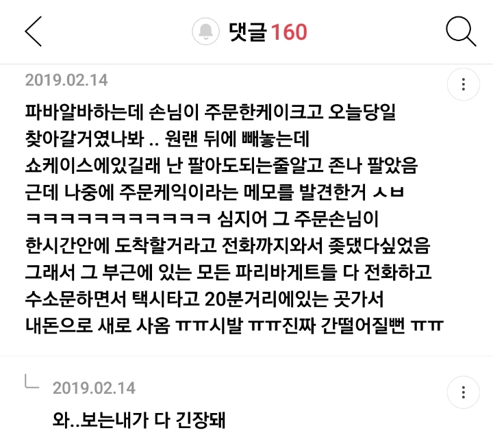 작성자대답훼 작성시간 19.12.26 패스트푸드점 알바 들어간 지 얼마 안 됐을 때 거기가 엄청 한가해서 혼자 하느라 누구한테 물어볼 수도 없었는데 싱글세트가 싱글이라 “혼자 먹을만큼” 만 생각하다가 치킨 2조각 나가야괴는데 한 조각만 포장해서 나감... 그 손님 집에 도착해서 전화와가지고 집 앞까지 갖다드렸음^^.......