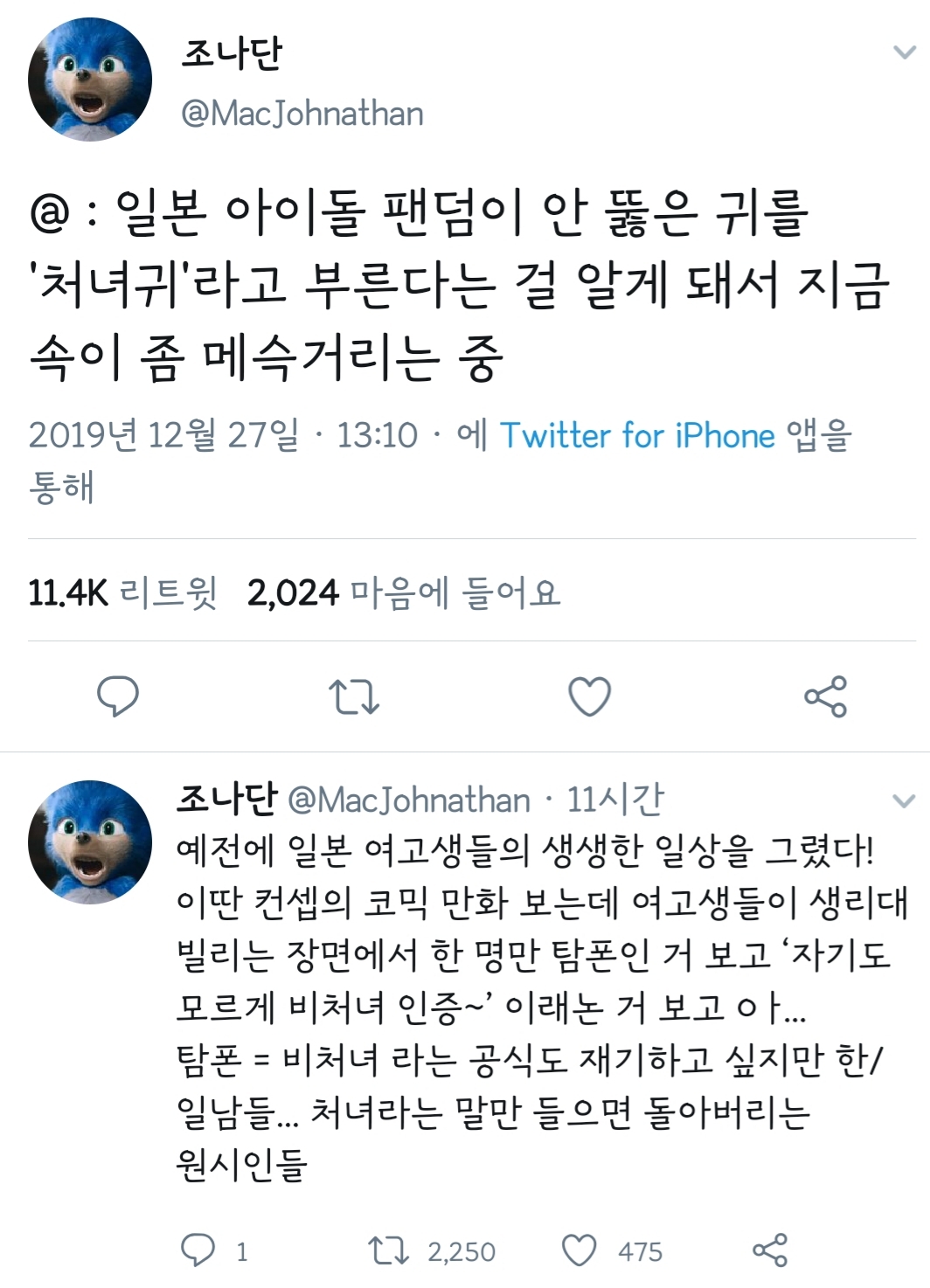 [기타]일본 아이돌 팬덤이 안 뚫은 귀를... 작성자서지혜(1984.8.24)|작성시간19.12.28|조회수15,098 목록 댓글 10 글자크기 작게가 글자크기 크게가 출처 :https://twitter.com/MacJohnathan/status/1210412719179829254?s=19ㅅㅂ 존나 더러워 죽겠네... 다음검색 현재 게시글 추가 기능 열기 북마크 공유하기 신고 센터로 신고 댓글 댓글 10 댓글쓰기 답글쓰기 댓글 리스트 작성자고양이는왜귀여울까 | 작성시간 19.12.28 난생처음듣는다.. 미친새끼들 뇌구조가어떻게되있는겨 작성자화이트 초콜렛 프라푸치노 | 작성시간 19.12.28 아 맞아 자기가 좋아하는 여돌 귀뚫으면 탈덕하는 사람도 있음.... 뭐 귀 안뚫는 일본 여자 많아서 귀찌가 발달하긴 함... 작성자enero | 작성시간 19.12.28 토나와 작성자웨인 그레츠키 | 작성시간 19.12.28 변태새끼들 작성자헬렌 킬러 | 작성시간 19.12.28 개더러워 시바 댓글 전체보기