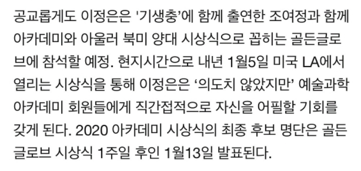 2020년도 골든글로브와 아카데미에 이정은배우와 조여정배우가 참석한다는 거 알려주고 끝낼게!