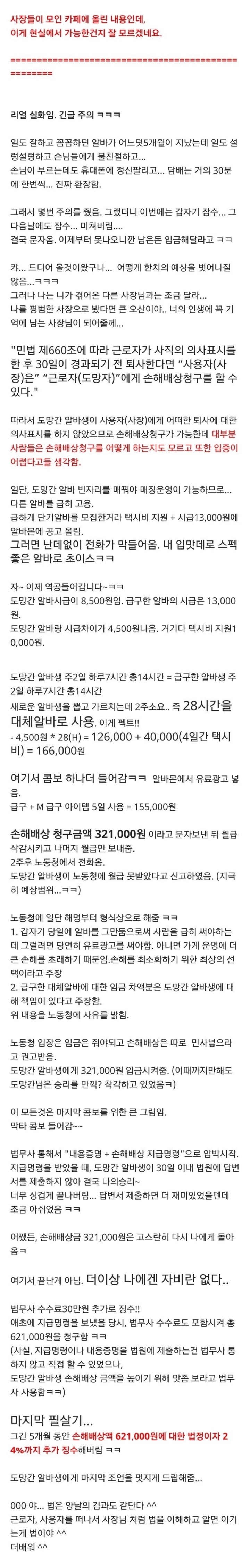 작성자상가주인 작성시간 20.01.13 나도 진짜 잠수타는 알바 경험있는데 와... 대타구해지기전까지 혼자 일 처리 다하는데 찾아가서 죽이구싶드라 저 법이 사실이라먼 너무나 유용한 팁인듯