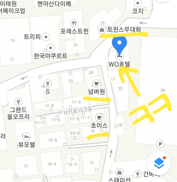 상호명들 보여?ㅋㅋㅋㅋㅋ넘버원.. 초이스..ㅋㅋㅋ 그 와중에 넘버원 가게 바로 맞은편에 위치한 wo호텔^^,, 친구랑 보고 '야 저기 ㄸ냐들 핫플 아니냐; 저기서 샤워하면...' 이러면서 질겁함ㅋㅋㅋㅋㅋㅋ