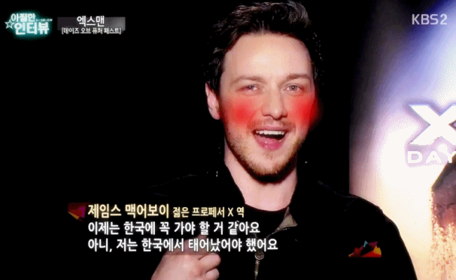 제임스 맥어보이가 한국에서 마이클 패스벤더보다 자신이 더 인기가 많다는 얘기를 듣고 기뻐하고있다.