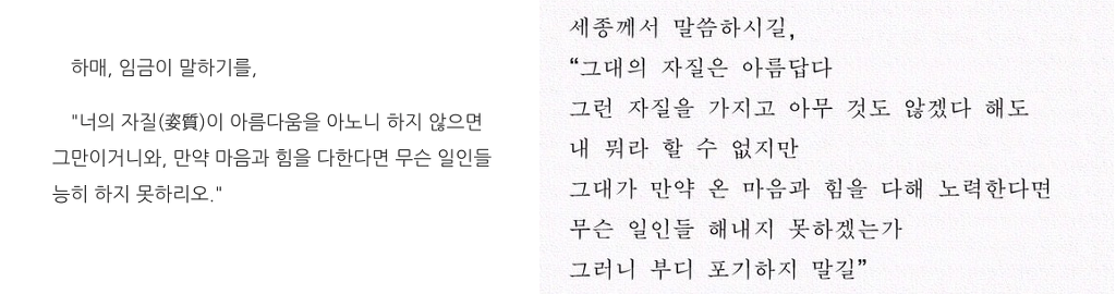 요즘 애들 다들 멍청하던데 네가 공부 열심히 하더라? 계속 집현전에 두고 싶었는데 너는 내 옆에 오래 있어서 그런지 내 말귀를 알아 들어서 함길도로 보내는거야 가서 게으르지 말고 일 잘해라
