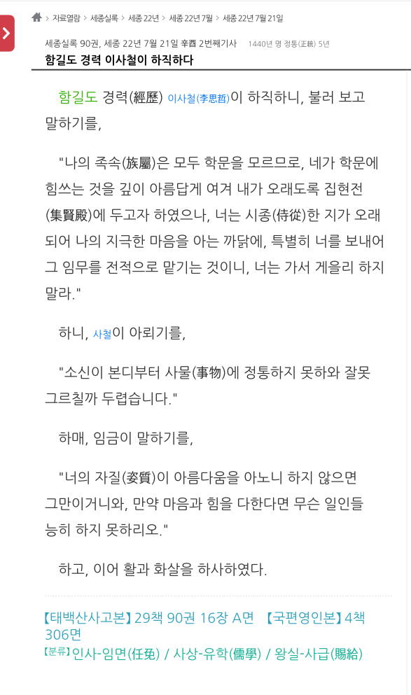 짤에 적힌 대로 세종 22년 7월 21일의 실록을 찾아보았다