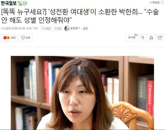 또 스스로 비수술 트젠이라고 밝혔던 박한희 변호사가 비수술 성별정정허가를 법제화