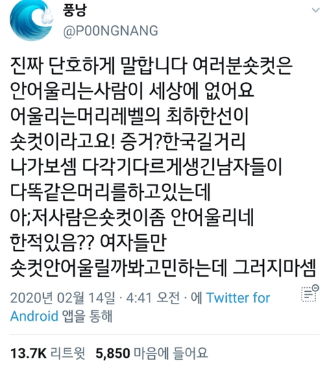 숏컷은 여자가 길거리 와꾸빻은 한남들보다 37628832배 잘어울리기 때문에ㅠ 자들자들 질투나서인 것으로 판명