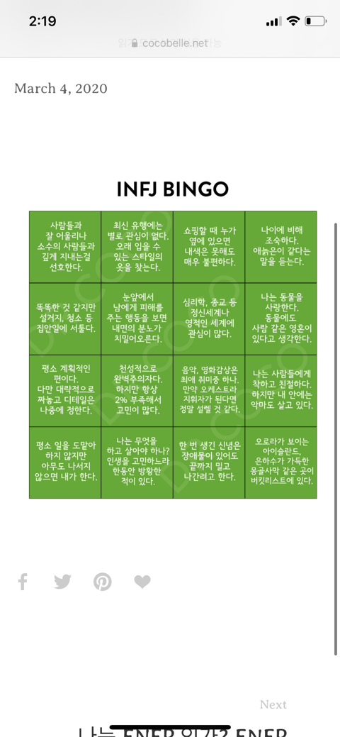 [흥미돋]신비로운 사람들 INFJ 빙고.mbti 작성자Mbti봇|작성시간20.03.04|조회수13,527 목록 댓글 73 글자크기 작게가 글자크기 크게가 출처 : https://www.cocobelle.net/ 나는 INFJ인가? INFJ BINGO — COCOBELLE여기를 눌러 링크를 확인하세요www.cocobelle.net 다음검색 현재 게시글 추가 기능 열기 북마크 공유하기 신고 센터로 신고 댓글 댓글 73 댓글쓰기 답글쓰기 댓글 리스트 작성자루릴람마 | 작성시간 20.04.30 4개빼고 다 맞음 이미지 확대 작성자나만동숲없어 | 작성시간 20.05.09 유교걸이라 집안일빼곤 다 올빙고 작성자강화필름 | 작성시간 20.05.10 굳이 동그라미를 왜쳐 전부다 내얘긴데^^ 작성자집줘 | 작성시간 20.06.12 몽골 인생 최고여행지 ㅋㅋㅋㅋㅋㅋ 설거지청소같은건 자취하다가 늘어서 할땐잘하고신념을 끝까지밀고나가진않는 것 같음 자꾸 내 신념이 맞는지 혼자 검토하는듯... 의심하고... 이미지 확대 작성자웅이웅 | 작성시간 21.05.17 ...다 나네...? 댓글 전체보기