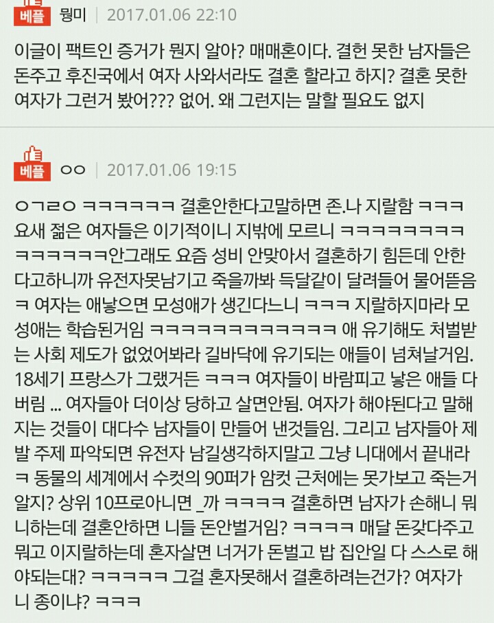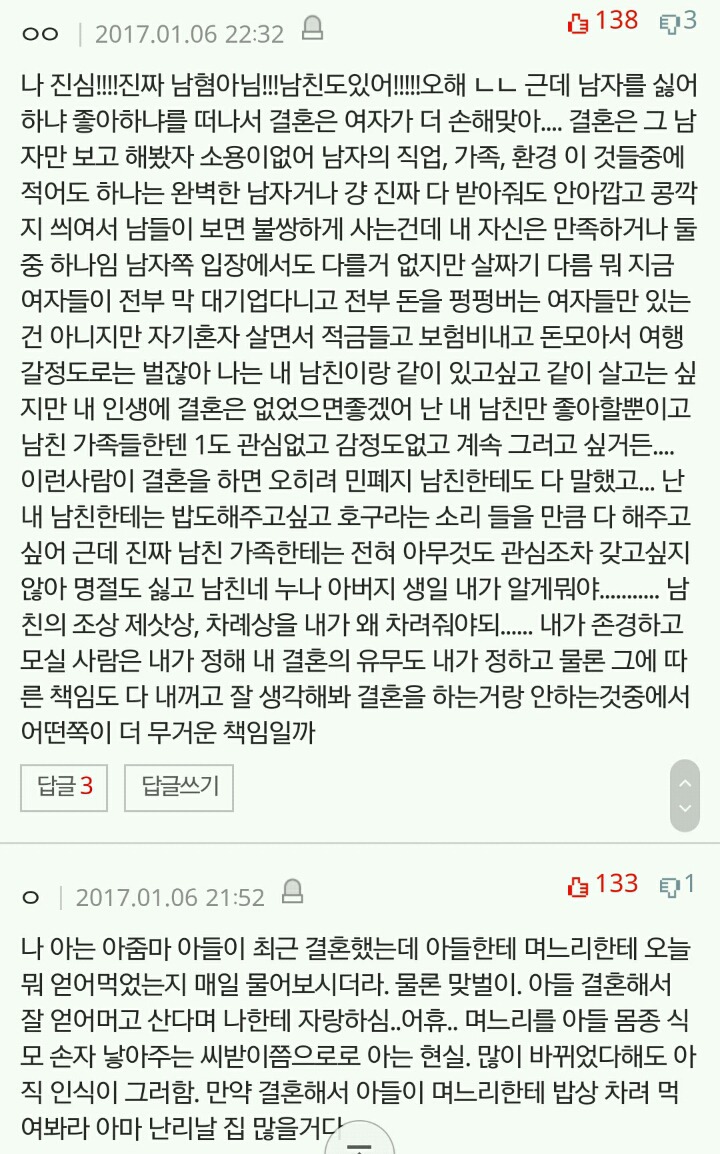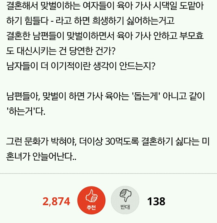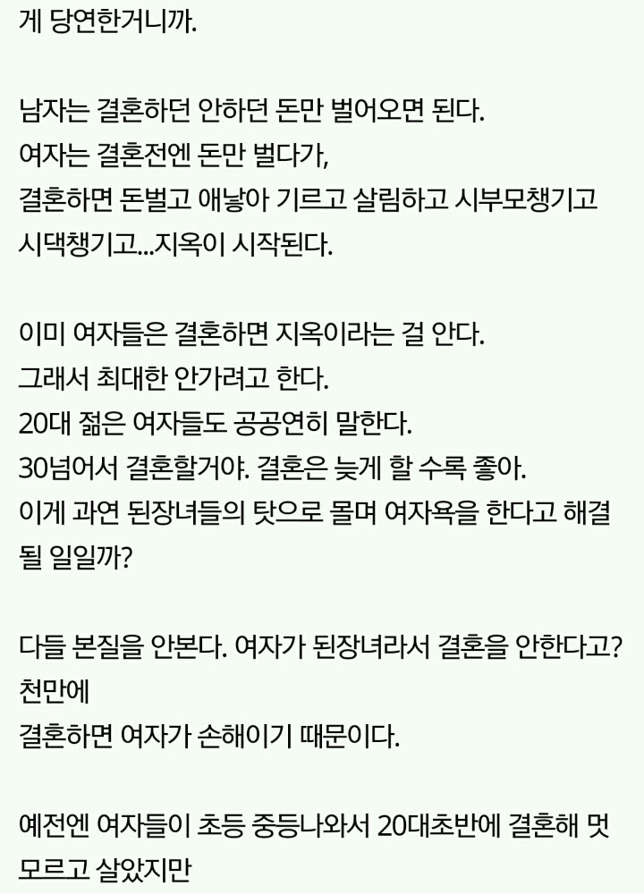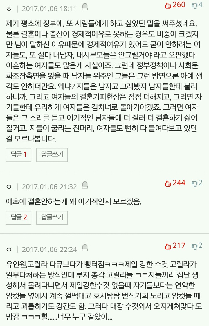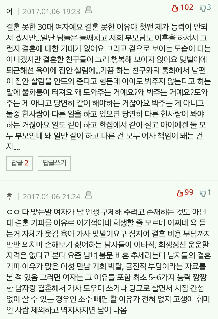 작성자세인트 엑소시스트 작성시간 20.03.08 결혼안하는게 이기적이라는 말 자체가 냄져들이 이득누렸다는걸 증명하는 꼴이자나? 진짜 여남평등한게 결혼생활이라면 한쪽이 결혼안하겠다고 나와도 손해볼것이 없는데 왜 이기적이라고함?