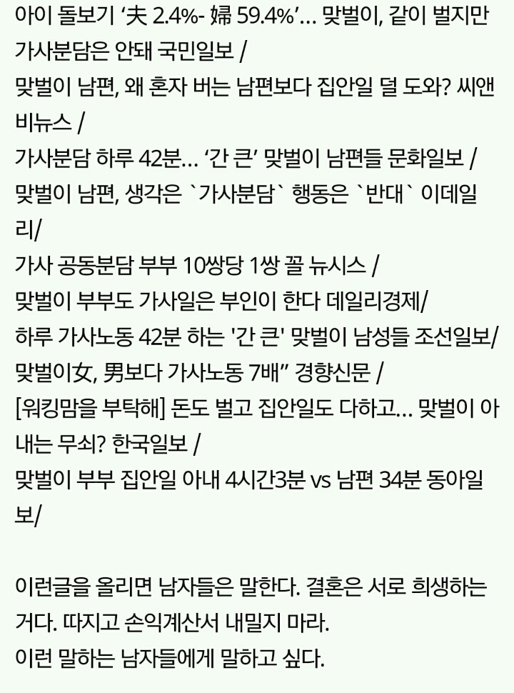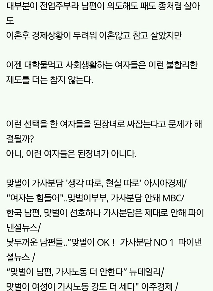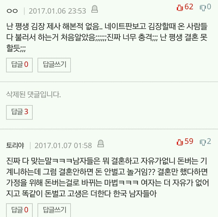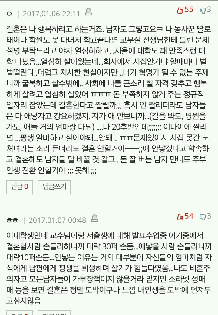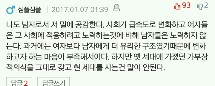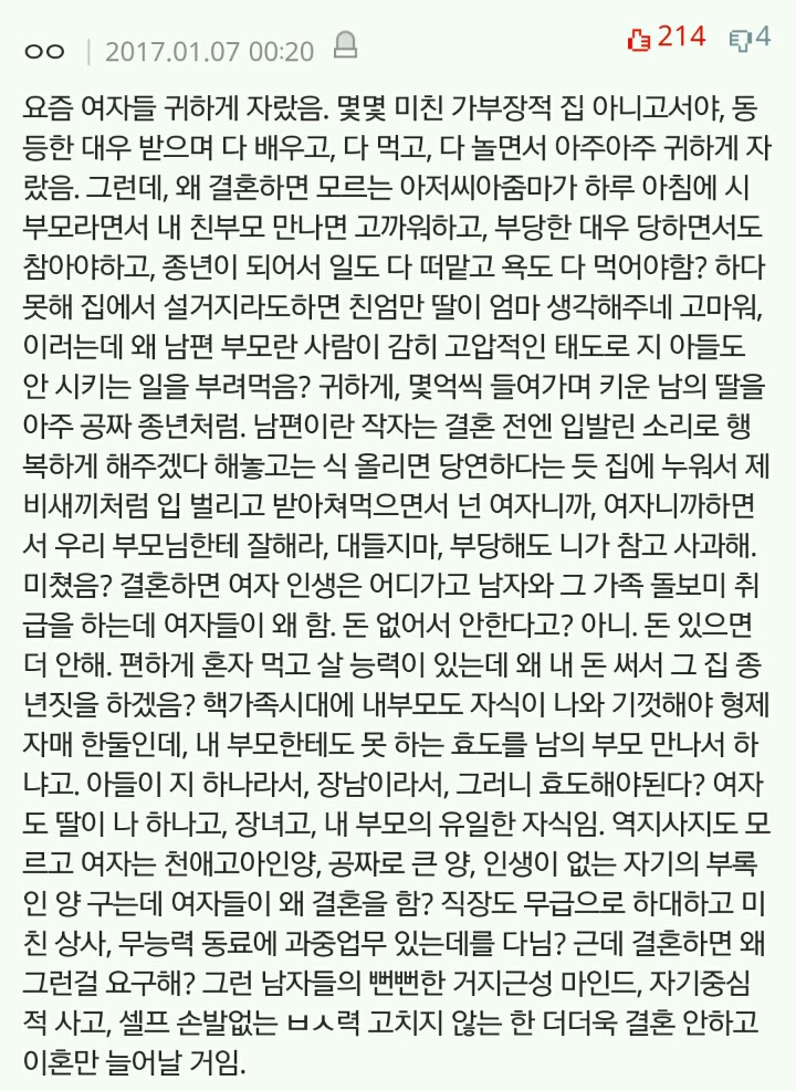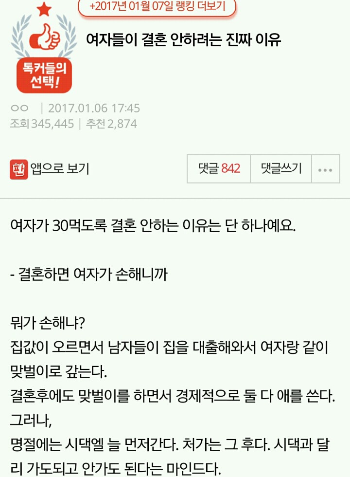 작성자세인트 엑소시스트 작성시간 20.03.08 결혼안하는게 이기적이라는 말 자체가 냄져들이 이득누렸다는걸 증명하는 꼴이자나? 진짜 여남평등한게 결혼생활이라면 한쪽이 결혼안하겠다고 나와도 손해볼것이 없는데 왜 이기적이라고함?