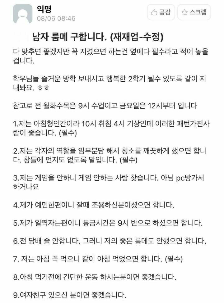 [기타]남자 룸메 구합니다...jpg 작성자갤럭시를줄게|작성시간20.03.09|조회수10,870 목록 댓글 48 글자크기 작게가 글자크기 크게가 출처 :여성시대 갤럭시를줄게 다음검색 현재 게시글 추가 기능 열기 북마크 공유하기 신고 센터로 신고 댓글 댓글 48 댓글쓰기 답글쓰기 댓글 리스트 작성자i블리츠크랭크 | 작성시간 20.03.09 군머아니지? 작성자헌터 샤퍼 | 작성시간 20.03.09 소울메이트를 찾고있네 작성자반대로 다른 세계는 | 작성시간 20.03.09 4시 기상 미쳤냐고요 ㅠ 작성자강패갈매기 | 작성시간 20.03.09 명박이 4시에 일어나지않나? 명박이한테 연락해봐! 작성자사랑받는 여시 | 작성시간 20.03.10 4시기상ㅋㅋㅋㅋ 10시취침 10시기상이라면 가능한데 댓글 전체보기