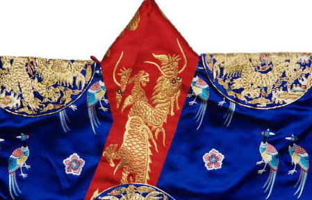 금색 실로 적계문(翟鷄文)을 수놓은 짙은 청색의 하피를