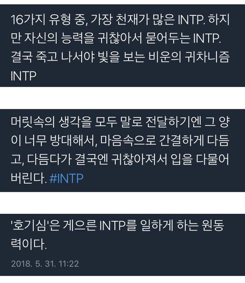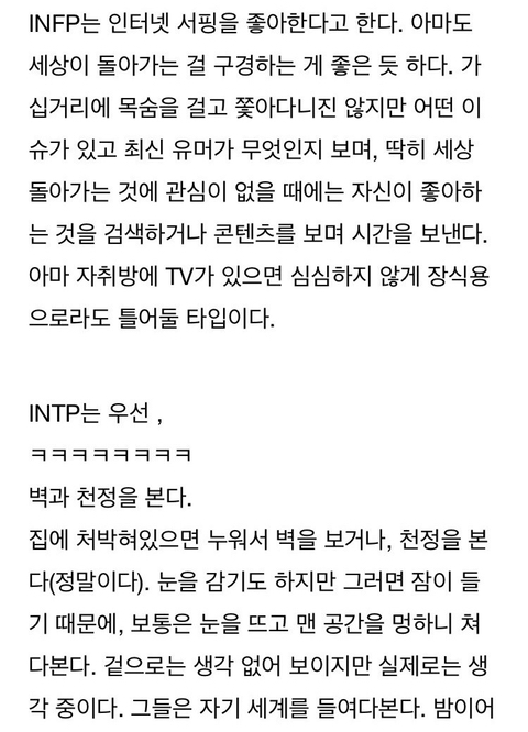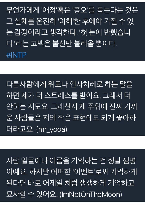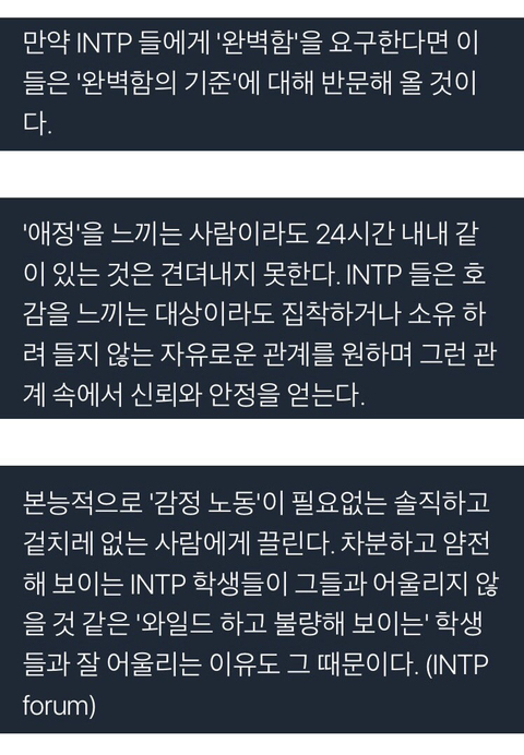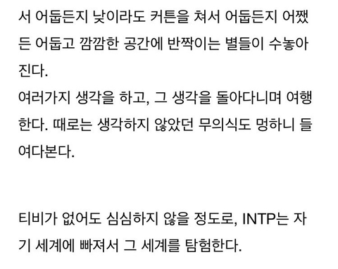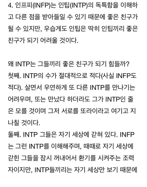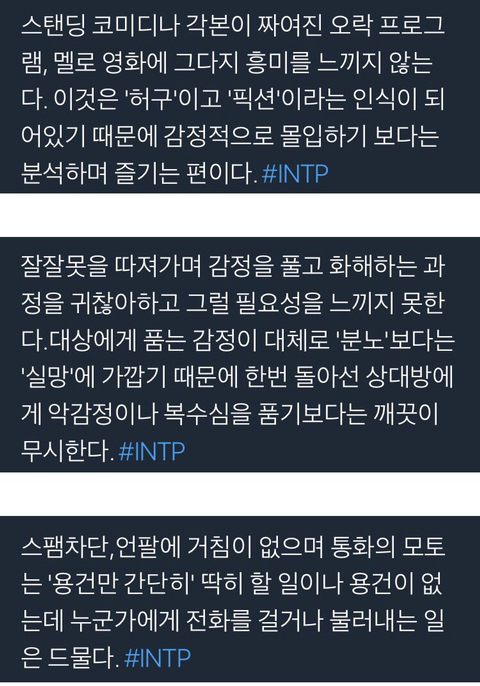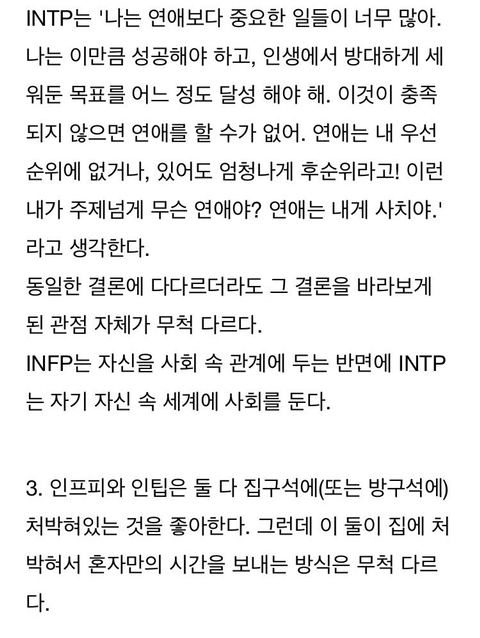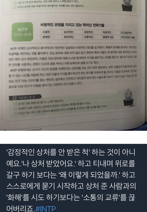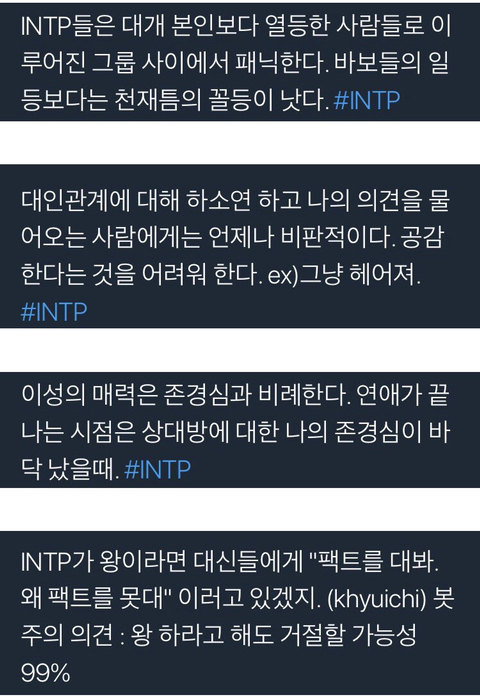 [흥미돋]INTP 특징 작성자햄쓱터입니다|작성시간20.03.15|조회수43,920 목록 댓글 248 글자크기 작게가 글자크기 크게가 출처 : 여성시대 햄쓱터입니다예전에 intp이었을때 모아둔해석들! 다음검색 현재 게시글 추가 기능 열기 북마크 공유하기 신고 센터로 신고 댓글 댓글 248 댓글쓰기 답글쓰기 댓글 리스트 작성자독기가득한여시 | 작성시간 20.03.27 나두인팁! 댓글 보는데 여시들 나랑 재질 비슷해 진짴ㅋㅋ신기.... 작성자sentimentalis | 작성시간 20.03.31 와 개공감ㅋㅋㅋㅋㅋㅋㅋㅋㅋ 작성자가라나다 | 작성시간 20.04.03 와 대박 다맞아ㅋㅋㅋㅋㅋㅋㅋㅋㅋㅋㅋㅋㅋㅋㅋㅋㅋ 작성자BrMy | 작성시간 20.05.02 👍 작성자티엠아이대잔치 | 작성시간 20.07.01 헐 나야.. 댓글 전체보기