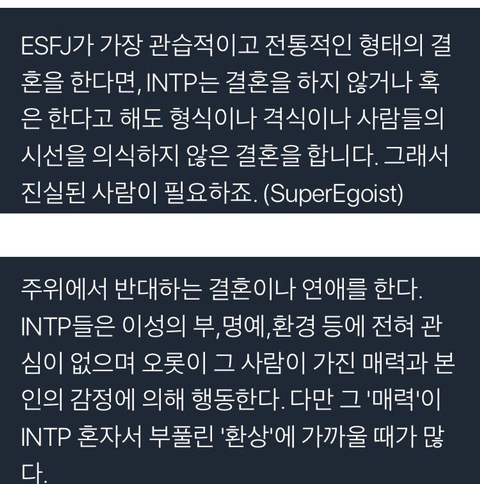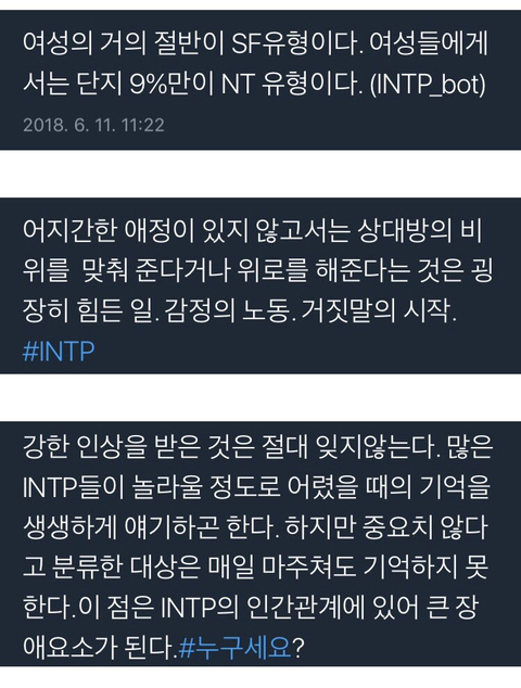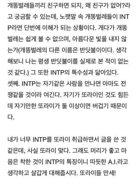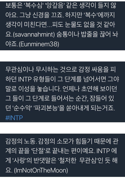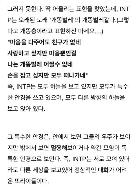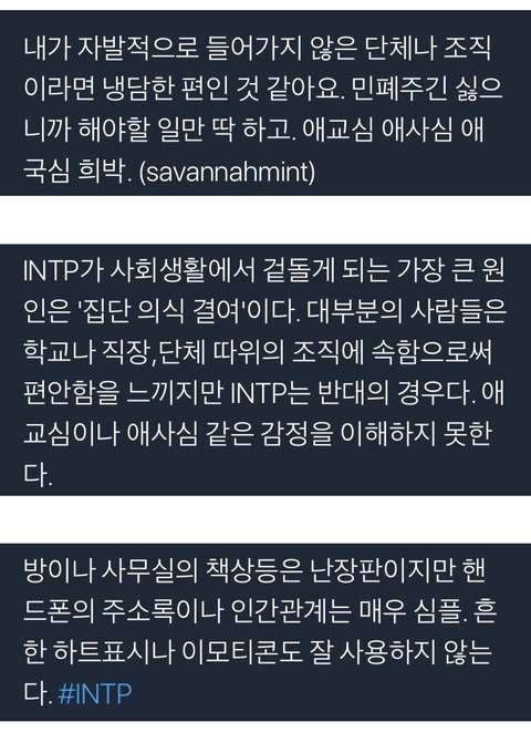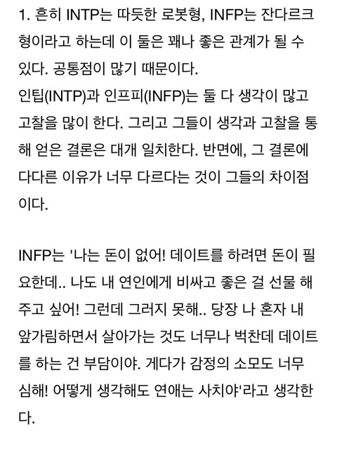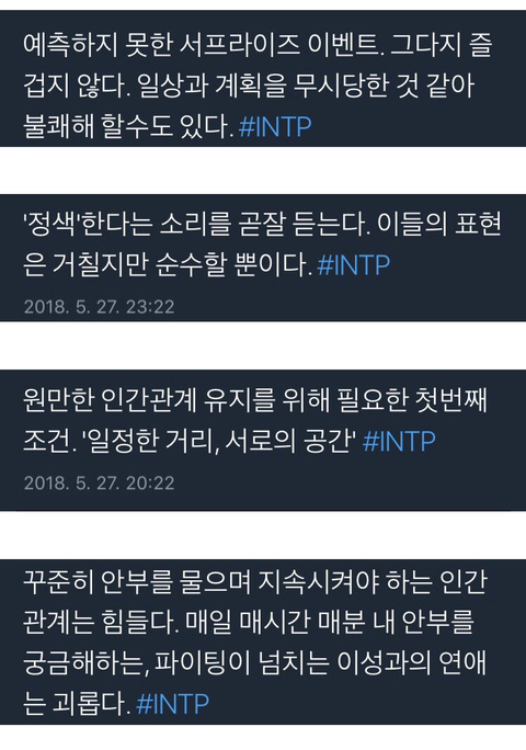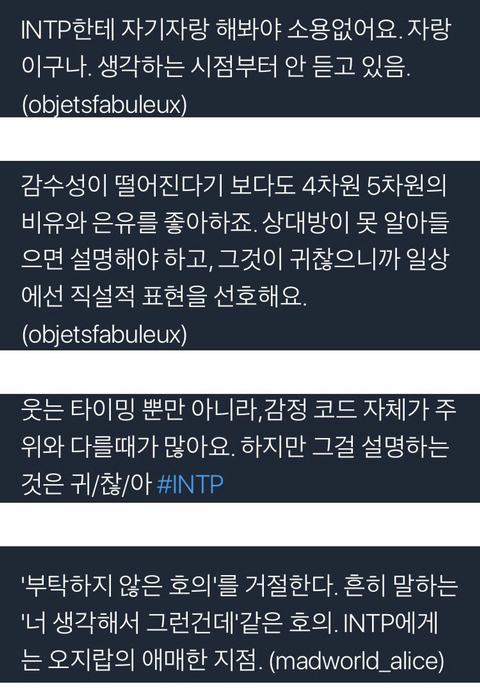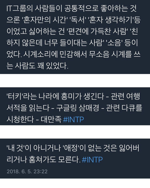 [흥미돋]INTP 특징 작성자햄쓱터입니다|작성시간20.03.15|조회수43,920 목록 댓글 248 글자크기 작게가 글자크기 크게가 출처 : 여성시대 햄쓱터입니다예전에 intp이었을때 모아둔해석들! 다음검색 현재 게시글 추가 기능 열기 북마크 공유하기 신고 센터로 신고 댓글 댓글 248 댓글쓰기 답글쓰기 댓글 리스트 작성자독기가득한여시 | 작성시간 20.03.27 나두인팁! 댓글 보는데 여시들 나랑 재질 비슷해 진짴ㅋㅋ신기.... 작성자sentimentalis | 작성시간 20.03.31 와 개공감ㅋㅋㅋㅋㅋㅋㅋㅋㅋ 작성자가라나다 | 작성시간 20.04.03 와 대박 다맞아ㅋㅋㅋㅋㅋㅋㅋㅋㅋㅋㅋㅋㅋㅋㅋㅋㅋ 작성자BrMy | 작성시간 20.05.02 👍 작성자티엠아이대잔치 | 작성시간 20.07.01 헐 나야.. 댓글 전체보기