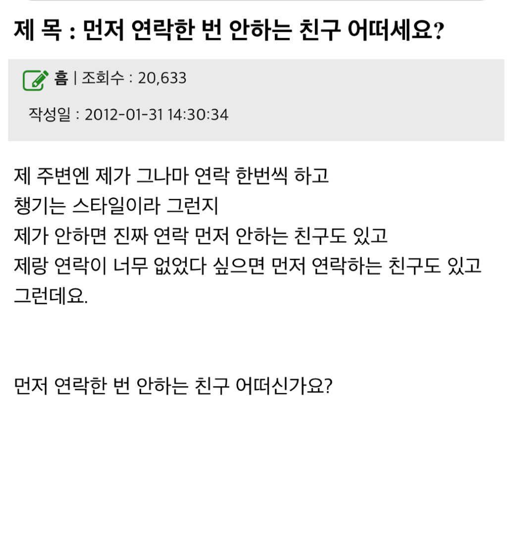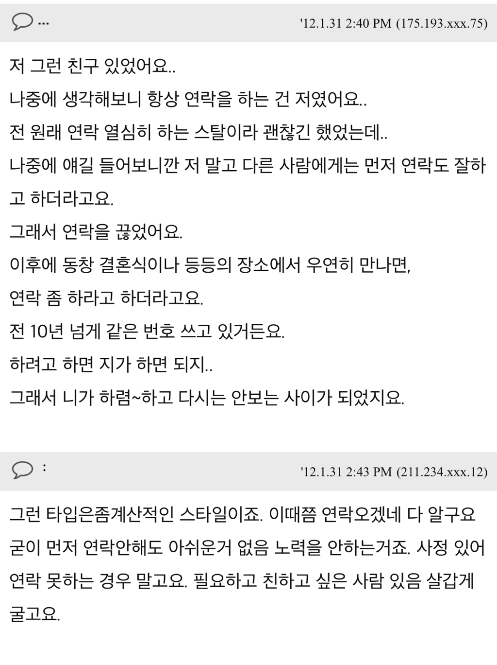 작성자밥밥비라라 작성시간 20.03.23 쌍방이 찾아야 되는거 넘나 당연함 난 연락 안해도 친구가 먼저하던데??하는 애들은 친구의 찐사랑의 감사의 눈물 흘리고 선톡할것