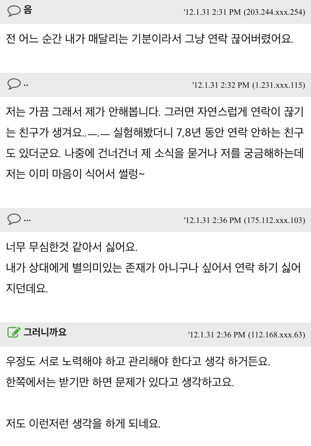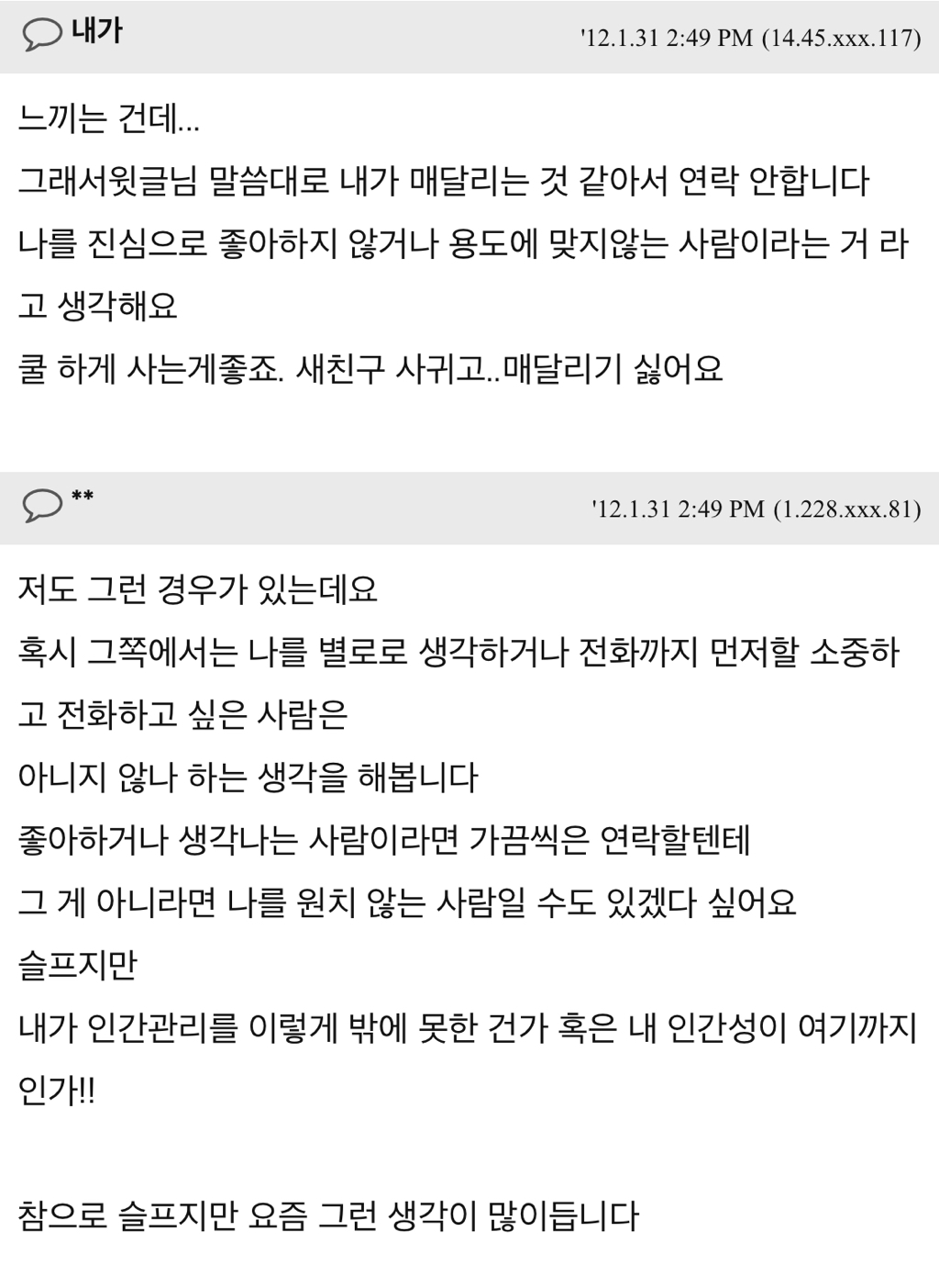 작성자매직카펫라이드 작성시간 20.03.23 오래전부터 알던 공시 준비+ 남친 있는 친구 예전엔 내가 더 연락하거나 만나자고 하는 편 이였는데 언젠가 남친이 친구보다 우선이라는 얘기 하는거 듣고나서 아 그냥 어차피 언젠간 멀어질 애 인거 같아서 먼저 연락올때만 답하는 중