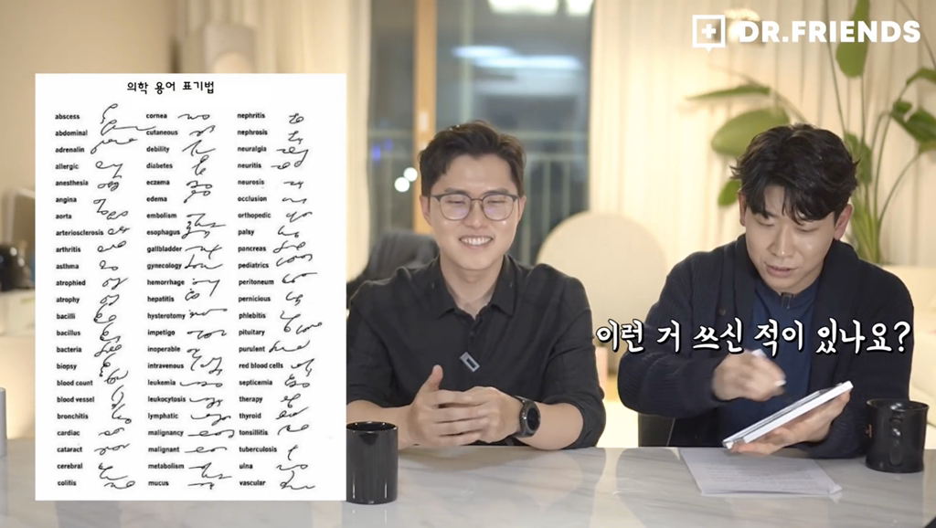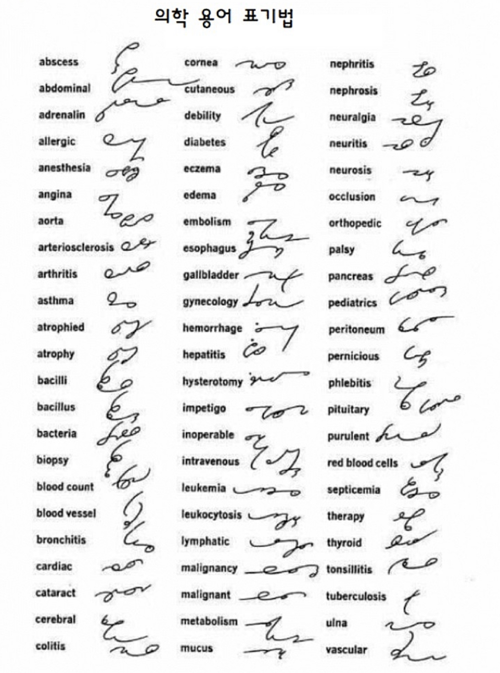 결론: 미국에서는 사용할지도 모르지만 ^국내에서는^ 배우지도 사용하지도 않는다 간혹 영어로 된 의학용어를 날려 써서 차트 보기 힘든 의사는 있지만 저런 외계문자 같은 필기체는 ^국내에서는^ 없다고 합니다