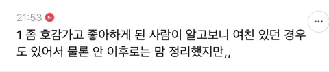작성자궁짱 작성시간 20.04.07 맘생기더라도 애인있다고 하면 맘을 비우게 되던데..