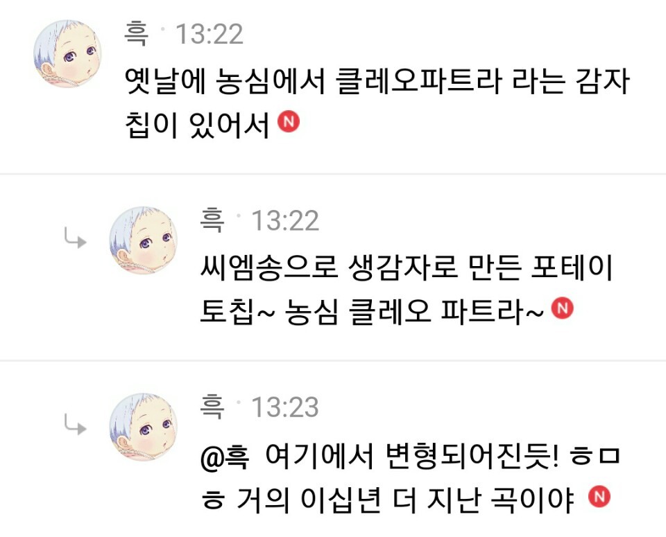 작성자킥바나나킥 작성시간 20.04.11 ㅋㅋㅋㅋㅋㅋㅋ 나도 신입생때 진짜 저게뭐지 싶어서 세번 물어봤음ㅋㅋㅋ 뭐라고요? 포테이토칩이요? 포테이토칩?? 클레오파트라? 이러면섴ㅋㅋㅋ