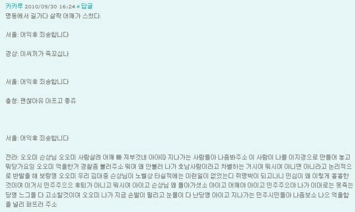 응 전라도 + 김대중 대통령 비하 투성이 ㅇㅇ 일베발 용어 맞는데 쓰니까 재밌어?ㅠ 신나?ㅠ 막 본인이 힙한 유행어 장난충이 된 것 같애?ㅠ 슨상님 쓰면서 주접 떠니까 막 재밌어진 기분이야?ㅠ