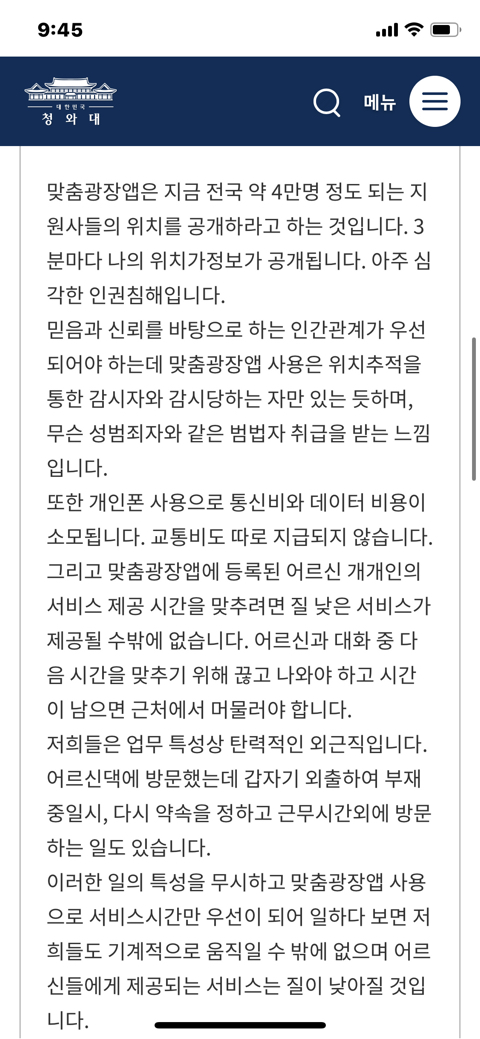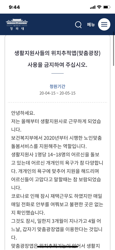 생활지원사들의 위치추적앱(맞춤광장) 사용을 금지하여 주십시오. > 대한민국 청와대나라를 나라답게, 국민과 함께 갑니다.www1.president.go.kr