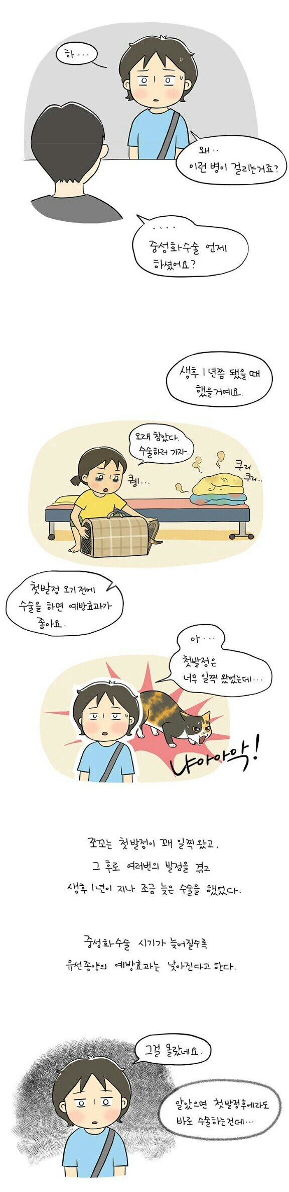 + 혹시 이 글 보고 중성화 늦게 해줬다고 자책하지마 만화보면서 작가님이 자책한것도 마음 아팠고 중성화 늦게 한 사람들 뭐라할 의도로 가져온게 아니라 아직 중성화 중요성 모르는 사람들이나 곧 반려묘견을 키울 사람들이 읽었으면 해서