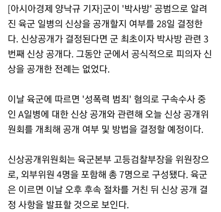 [여시뉴스데스크]'박사방' 공범 육군 일병 신상공개 오늘 결정(상보) 작성자에너지소비효율등급|작성시간20.04.28|조회수2,307 목록 댓글 22 글자크기 작게가 글자크기 크게가 출처 : http://naver.me/FWmFJE65전문 출처아까 같은 기사 속보로 올라왔었는데 내용 추가돼서 올려제목만 보고 헷갈릴수 있을것 같은데신상 공개 결정된게 아니라 신상 공개 여부를 결정하는거야!!!!말 장난 오져 ㅎ 다음검색 현재 게시글 추가 기능 열기 북마크 공유하기 신고 센터로 신고 댓글 댓글 22 댓글쓰기 답글쓰기 댓글 리스트 작성자국밥처돌이여 | 작성시간 20.04.28 공개하고 죽여 작성자한남잦이소멸잦잉 | 작성시간 20.04.28 공개가자 시발 작성자웅동자 | 작성시간 20.04.28 개질질끌어 시발 작성자메갈리아 | 작성시간 20.04.28 공개해 시발 작성자N번방 신상공개해라 | 작성시간 20.04.28 26만명중에 겨우 3명한거잖아 다 공개해 댓글 전체보기
