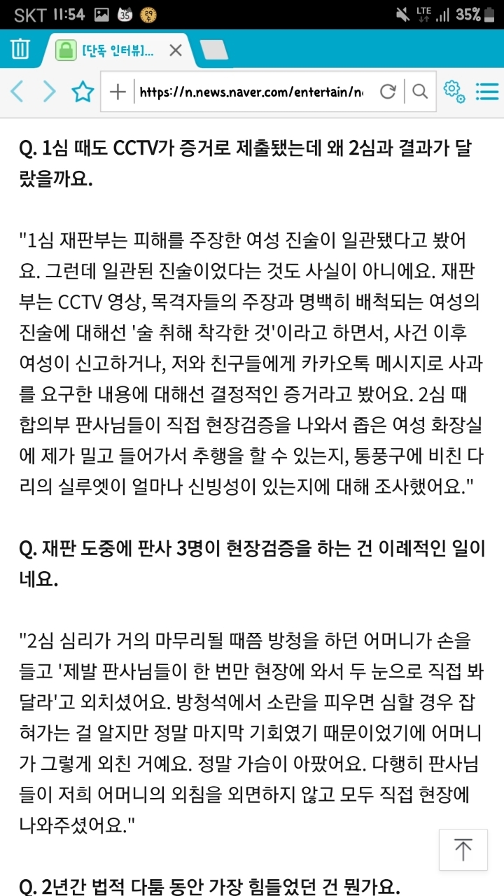 [여시뉴스데스크][단독 인터뷰] 배우 강은일 "성추행 무죄 확정...세상이 무섭습니다 작성자이은규|작성시간20.04.29|조회수15,232 목록 댓글 45 글자크기 작게가 글자크기 크게가 출처 :https://n.news.naver.com/entertain/now/article/416/0000257710전문은 출처로! 다음검색 현재 게시글 추가 기능 열기 북마크 공유하기 신고 센터로 신고 댓글 댓글 45 댓글쓰기 답글쓰기 댓글 리스트 작성자P펭수 | 작성시간 20.04.29 저게 사실이라면 진짜 억울하겠다 전문 읽어보니 오해받을까봐 걱정이 많은듯.. 작성자마싯는시밤바 | 작성시간 20.04.29 판사들 현장 나가잖아 미스함무라비 저자가 그랬음 작성자니가민스유 | 작성시간 20.04.29 어휴 저는 중립입니다 ㅋ 작성자목살이조아삼겹살이조아 | 작성시간 22.04.29 한사람 인생 망치는거 참 쉬운듯... 작성자베이비 복스 | 작성시간 23.02.16 안타깝다.... 댓글 전체보기