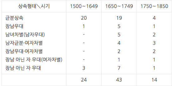 위의<표 6>에서 나타나는 바와 같이 토지의 상속은 대체로 노비의 분급경향과 일치하고 있다. 즉 조선 초기로부터 1600년대 중엽까지는 철저하게 아들과 딸의 구별이 없고 장남과 차남이하의 차별이 없이 균등하게 토지를 상속하였으나 1600년대 중엽 이후부터는 이러한 균분상속 형태의 비율이 줄어들고 자녀의 성별·출생순위에 따른 차등상속이 급격히 증가하기 시작하고 18세기 중기 이후는 이와 같은 차등상속이 일반화하기에 이르렀다.
