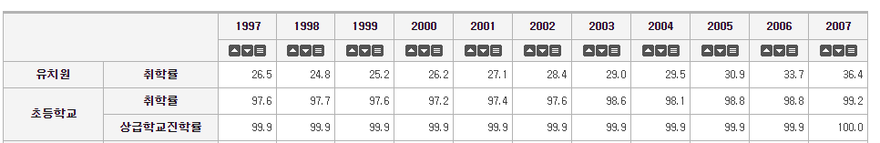 밑에 상급학교 진학률은 이 시기에 입학한 사람이 상급학교로 진학한 비율인지 아님 그 시기에 진학한 비율인지 헷갈려서 패스하긴 하겠다만 2007년~2013년 초등학교에서 중학교로 진학하는 비율이 100프로임;