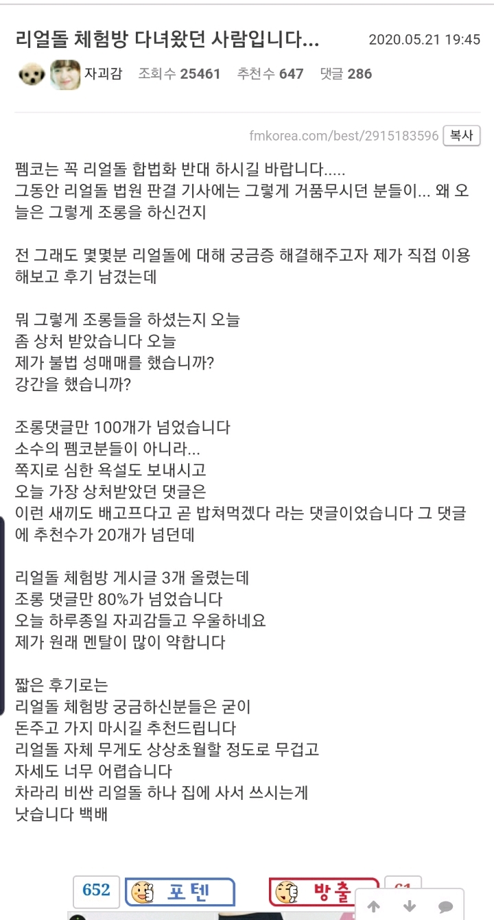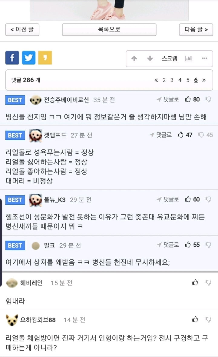 작성자김로키 작성시간 20.05.21 아...리얼돌 체험방 가는 남자들이 펨코하는구나 ㅎㅎ... 무슨 오피? 같은것도 아니고 저거는 ㄹㅇ 여자 눈도 마주치기 어렵고 지 소추 속으로 비웃을까봐 무섭고 돈도 없는 한남씹타쿠중에서 티오피씹타쿠들이나 가는거같음ㅋㅋㅋㅋㅋㅋㅋㅋㅋ