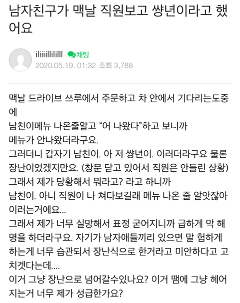 [스크랩] [기타]남자친구가 맥도날드 직원보고 쌍년이라고 했어요 작성자맥도날드릉드릉|작성시간20.05.22|조회수13,136 목록 댓글 51 글자크기 작게가 글자크기 크게가 . 다음검색 스크랩 원문 : 쭉빵카페 현재 게시글 추가 기능 열기 북마크 공유하기 신고 센터로 신고 댓글 댓글 51 댓글쓰기 답글쓰기 댓글 리스트 작성자이런악몽이라면영영깨지않을게 | 작성시간 20.05.22 별것도아닌데 저런욕이나온다고? 딱 수준보이잖아요 빨리 안전이별하시길 작성자세인트 엑소시스트 | 작성시간 20.05.22 아가리 걸레새끼 작성자pour vous | 작성시간 20.05.22 수준봐 ... 작성자백예린의 발민수 | 작성시간 20.05.22 저급해 딱 수준 나오죠 해당 댓글은 작성자와 운영진만 볼 수 있습니다. 댓글 전체보기